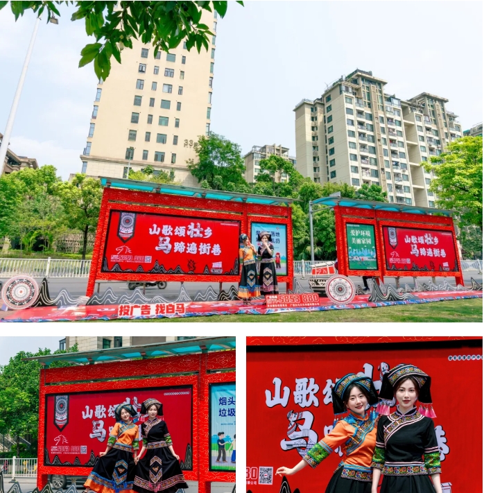 三月三,穿傳統(tǒng)服飾過(guò)節(jié)必不可少。瞧,公交候車亭也穿上了節(jié)日的盛裝,鮮艷的色彩、精美的圖案,濃濃的民族風(fēng)情,為城市增添了一道亮麗的風(fēng)景,營(yíng)造了濃厚的節(jié)日氛圍。圖為賽揚(yáng)傳媒公司員工身著傳統(tǒng)服飾在公交候車亭旁合影。