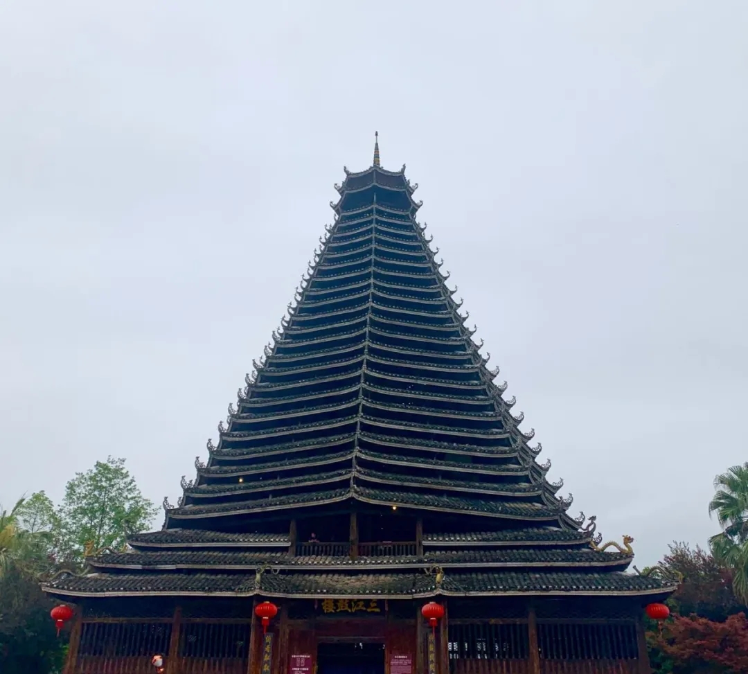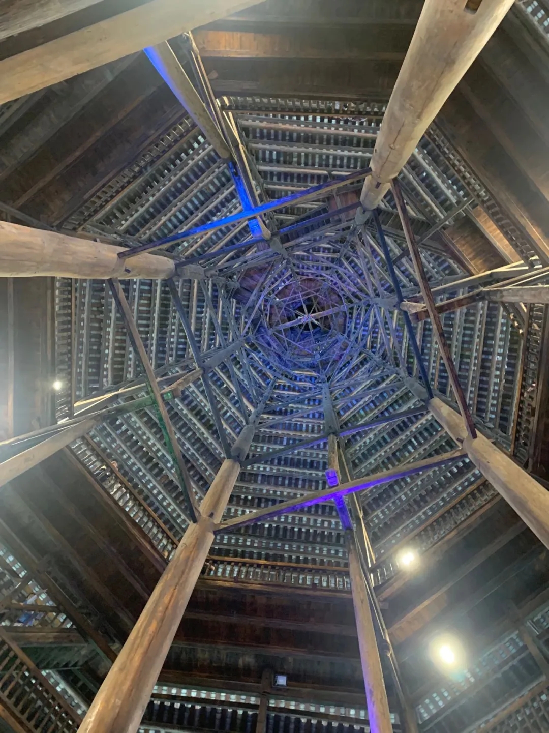仰觀閃閃魔幻,感受侗族建設的精美藝術,把疏密、粗細、剛柔等完美地結成一個整體,展現侗族工匠的精美建筑技藝。不用一顆鐵釘,結構十分嚴謹穩(wěn)固。樓內四根杉木大柱直徑都超過70厘米,樹齡均在百年以上,這在鼓樓建筑史上是唯一的。